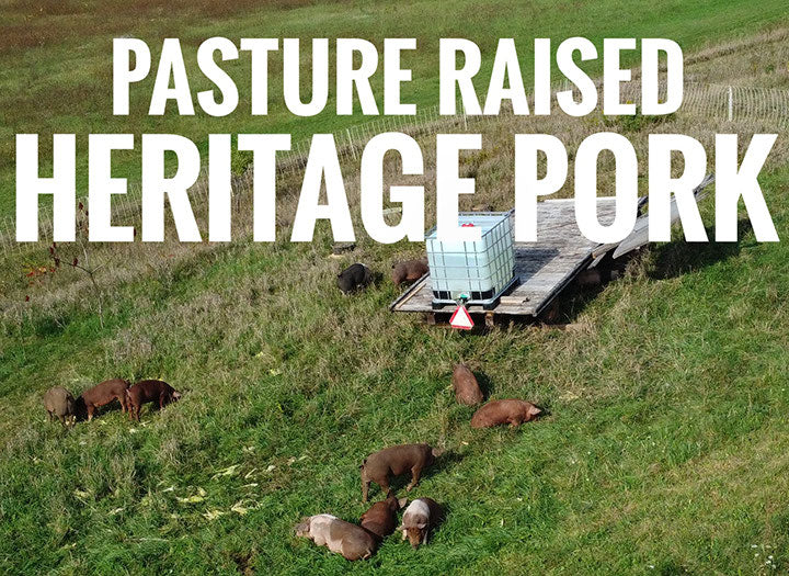Naturally smoked, thick cut bacon in approx 0.75lb (375g) packages. Our bacon is lightly salted and has significantly less nitrate than conventional bacon. A premium eating experience, our pork comes from heritage and rare breed pigs (Berkshire, Tamworth, Hereford) raised with the highest standards of animal welfare and ecological land management. Our pigs roam the pastures foraging for roots and grazing forbs and grasses, free to express their instincts to run, root, and play. We manage their impact on the land as part of our multi-species rotational grazing system. Their presence in this systems helps revitalize the degraded old-field landscapes we are working with here at Evermeadow Farm.
